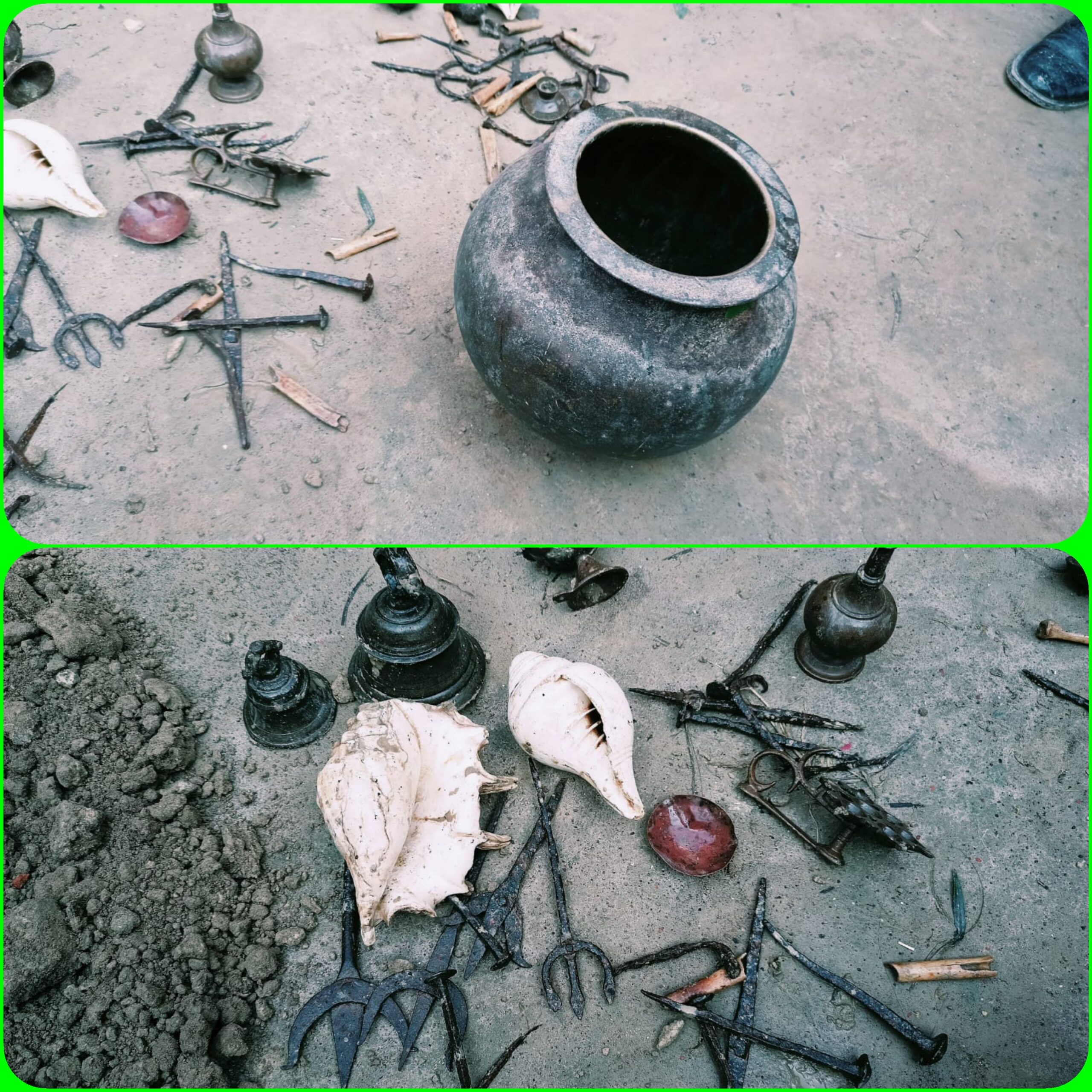 जगदीशपुर भलुआन गांव के नया चौराहा के रहने वाले नूर मोहम्मद के सभी बच्चों की शादी हो चुकी है लेकिन बेटियों में किसी को बच्चा नहीं हुआ। इसे लेकर उनका परिवार काफी परेशान था। पुलिस के मुताबिक इलाज के अलावा उन्होंने तंत्र-मंत्र का भी रास्ता अपनाया। नूर मोहम्मद के बड़े दामाद गगहा निवासी आलम शेख की मुलाकात गोरखपुर में मौलवी से हुई। मौलवी ने बताया कि उनके घर में ही दोष है। किसी ने कुछ जादू-टोना कराकर घर में कुछ गाड़ दिया है, जिसकी वजह है कि बेटियों को बच्चे नहीं हो रहे हैं।इतना ही नहीं, मौलवी ने यह भी बताया कि घर में ऐसी संदिग्ध वस्तुओं के गड़े होने से घर की सुख-शांति भी भंग हो गई है। मौलवी के कहने के मुताबिक आलम शेख ने इसका उपचार शुरू किया। मौलवी के बताई जगह पर मंगलवार को घर में खुदाई शुरू करा दी। जमीन की मिट्टी करीब चार फिट तक निकाले जाने के बाद उसमें एक मटका मिला। उसमें दीपक, घंटा, त्रिशूल, बर्तन, लोहे के कुछ सामान और हड्डियां मिलीं। उधर, घर में गड़े हुए घड़े में सोने का सिक्का मिलने की सूचना किसी ने पुलिस को दे दी। पुलिस पहुंची और पूरा सामान कब्जे में ले लिया।
