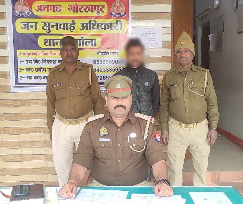 संदेश न्यूज़ 24गोरखपुर वरिष्ठ पुलिस अधीक्षक जनपद गोरखपुर के कुशल निर्देशन में पुलिस अधीक्षक दक्षिणी गोरखपुर व क्षेत्राधिकारी गोला के निकट पर्यवेक्षण मे थानाध्यक्ष अश्वनी कुमार तिवारी के नेतृत्व मे उ0नि0 जयराम यादव मय टीम द्वारा थाना स्थानीय पर पंजीकृत मु0अ0सं0 15/2023 धारा 376,504,506 भा0द0सं0 व 3(2)V एस0 सी0/एस0टी0 एक्ट से सम्बन्धित वाछिंत अभियुक्त सूरज उपाध्याय उर्फ भानू पुत्र रमेश उपाध्याय निवासी घोड़ालोटन थाना गोला जनपद गोरखपुर को गिरफ्तार किया गया । अन्य विधिक कार्यवाही की जा रही है ।